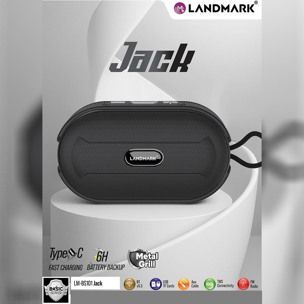 • The Landmark Jack LM-BS101 is a compact and powerful wireless speaker designed for music lovers. With Type-C fast charging, up to 6 hours of battery backup, and crystal-clear sound, it’s perfect for indoor and outdoor entertainment. The durable metal grill adds style and protection, making it a reliable everyday music companion.